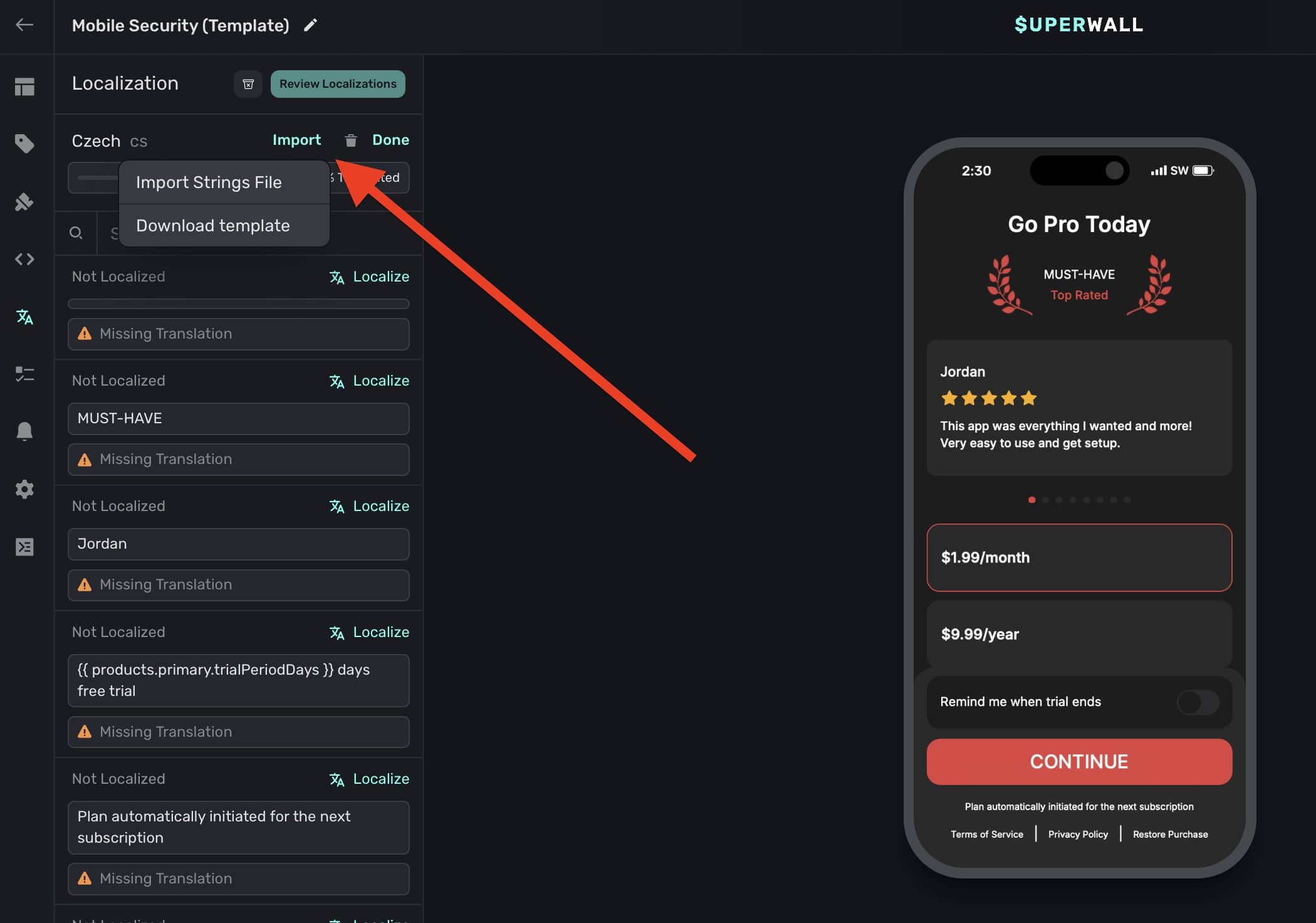 To localize your paywall, click on the Localization button from the sidebar: